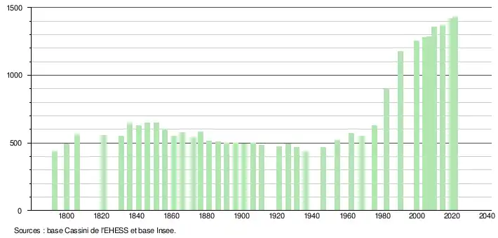 L'évolution du nombre d'habitants est connue à travers les recensements de la population effectués dans la commune depuis 1793. Pour les communes de moins de 10 000 habitants, une enquête de recensement portant sur toute la population est réalisée tous les cinq ans, les populations légales des années intermédiaires étant quant à elles estimées par interpolation ou extrapolation[25]. Pour la commune, le premier recensement exhaustif entrant dans le cadre du nouveau dispositif a été réalisé en 2004[26].