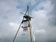 Une technique plus complexe consiste à construire plusieurs trépieds, reliés entre eux par une perche horizontale sur laquelle se tient le militant[2], ce qui le rend encore plus difficile à déloger.