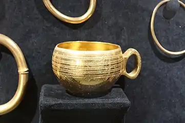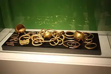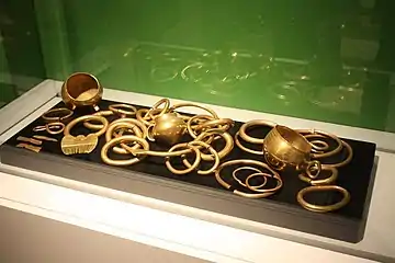 - 31 lingots annulaires, dont un grand (21 cm de diamètre et 870 g de poids) et le reste dans des tailles comprises entre 13 et 7 cm de diamètre (et entre 735 et 40 g de poids). Au début, le plus grand de ces anneaux était considéré comme un torque, et les plus petits comme des bracelets, mais ils sont aujourd'hui considérés comme des lingots d'or en forme d'anneau, à transporter sertis sur l'anneau plus grand, qui serait un porte-lingots. Celui-ci se termine par deux rivets plats avec un trou, une formule clairement différente de celle utilisée dans d'autres torques connus, et qui permettait d'ouvrir et de fermer facilement l'anneau. Trois de ces lingots présentent des signes d'avoir été coupés et pliés par les découvreurs, c'est-à-dire qu'ils auraient fait partie d'autres lingots annulaires plus grands (ce sont les plus petits, pesant entre 40 et 69 g).