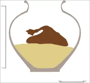 Les monnaies sont des nummi, pièces de bronze avec très peu d'argent, d'un poids de 3 grammes et de 18 mm de diamètre[B 1], introduites dans la décennie 330[G 4]. Les pièces sont accumulées sur une période de dix ans et déposées dans le vase dans de petites bourses[C 1] de tissu qui ont disparu[D 1]. Avec le temps, les éléments (écorce, cuir, papyrus, peau, tissu) qui constituent le sac se sont désagrégés et les pièces ont été libérées, mais en restant dans leur position d'origine[A 9]. Des épis de céréales semblent avoir volontairement été déposés dans le contenant pour en absorber l'humidité[A 10].
