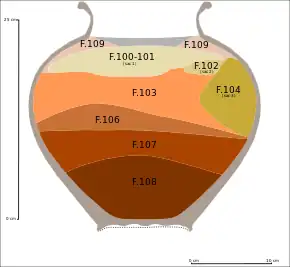 Le sac dénommé « Fait 100-101 » reposait sur un sédiment argileux[A 11]. Dans le sac « Fait 104 », une petite corde blanche est découverte, qui devait servir à nouer ce sac[A 12]. La majorité des couches ou « faits » sont séparés entre eux par de fines couches d'argile qui ont permis aux archéologues de séparer les différentes pièces « en vrac » par période[A 13].