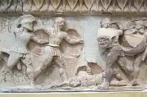 À un autre endroit de la frise, on voit une scène de la guerre de Troie, figurant un duel sur le cadavre d'un guerrier, où les deux adversaires sont flanqués respectivement des héros des Achéens à droite et de ceux des Troyens sur la gauche. La figure du vieux Nestor encourage les Grecs.
