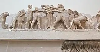 Détail du fronton : la dispute d'Héraklès et Apollon.