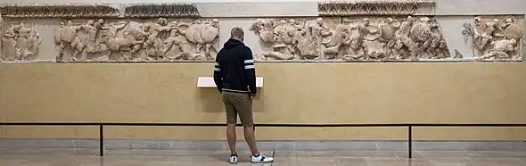 Le côté oriental représente une assemblée des douze Olympiens assis. Au centre (perdu) de l'assemblée, Hermès, tenant la balance remplie des âmes d'Achille et de Memnon, était représenté pesant les âmes (psychostasie). À gauche sont assis les dieux protecteurs de Memnon et des Troyens : Apollon, Arès, Aphrodite et Artémis. Au milieu est assis Zeus sur son trône. Sur l'autre moitié de cette frise, on distingue Achille et Memnon se disputant le corps d'Antiloque mort. La face ouest peut montrer l'histoire du jugement de Pâris, la mort d'Orion ou plutôt Athéna traduisant Héraklès sur l'Olympe[10]. Le côté nord affiche la Gigantomachie. La frise sud est la plus usée ; on discerne nettement les traces de chevaux magnifiquement sculptés : il a été suggéré que la scène représente l'enlèvement d'Hippodamie par Pélops ou des Leucippides par les Dioscures ou l'enlèvement de Perséphone par Hadès. Les reliefs ont été peints avec des nuances vives de vert, de bleu, de rouge et d'or, créant ainsi un code unique de polychromie.
