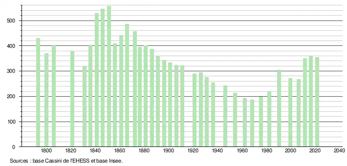 L'évolution du nombre d'habitants est connue à travers les recensements de la population effectués dans la commune depuis 1793. Pour les communes de moins de 10 000 habitants, une enquête de recensement portant sur toute la population est réalisée tous les cinq ans, les populations légales des années intermédiaires étant quant à elles estimées par interpolation ou extrapolation[21]. Pour la commune, le premier recensement exhaustif entrant dans le cadre du nouveau dispositif a été réalisé en 2006[22].