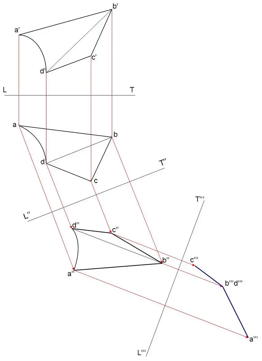 - Un premier changement de plan selon « L1 T1 » parallèle à la projection « ab » en vue d'obtenir la vraie grandeur « a1b1 » puis,