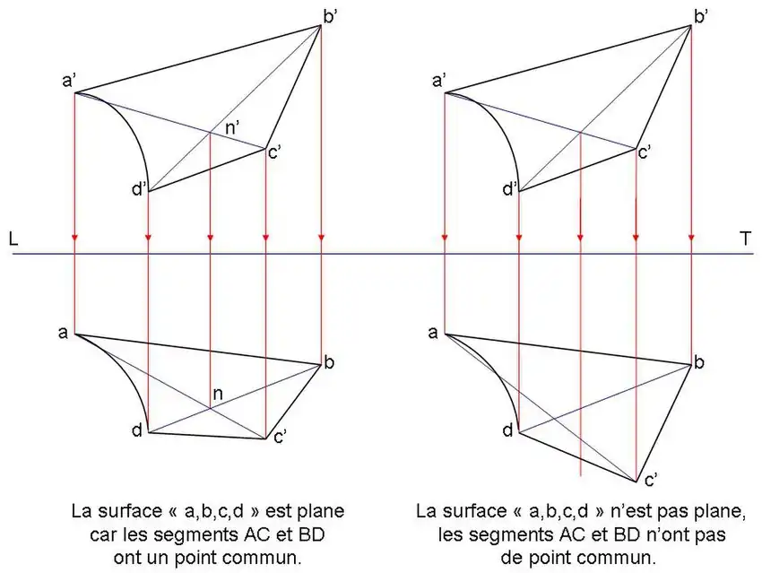 Pour qu'une surface quelconque de l'espace soit plane il importe que deux droites quelconques, non confondues, passant par deux points appartenant à cette surface soient concourantes.