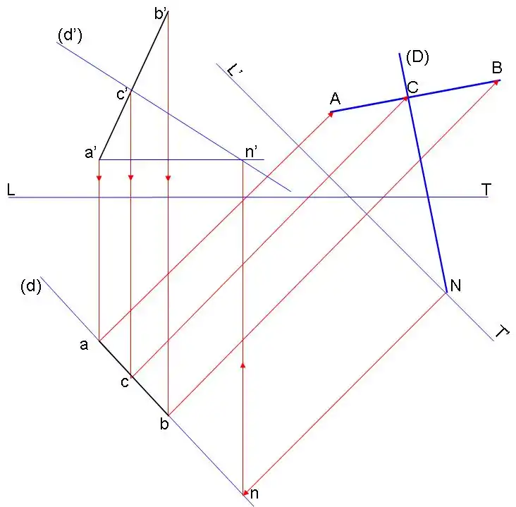 La maîtrise des techniques de traçage permet de construire (par exemple au compas) la perpendiculaire (D) au point (C) de la vraie grandeur d'un segment de droite AB ainsi que de représenter ses projections frontale (d') et horizontale (d).