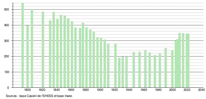 L'évolution du nombre d'habitants est connue à travers les recensements de la population effectués dans la commune depuis 1793. Pour les communes de moins de 10 000 habitants, une enquête de recensement portant sur toute la population est réalisée tous les cinq ans, les populations légales des années intermédiaires étant quant à elles estimées par interpolation ou extrapolation[32]. Pour la commune, le premier recensement exhaustif entrant dans le cadre du nouveau dispositif a été réalisé en 2004[33].
