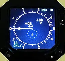 Si le trafic est équipé d'un transpondeur avec report d'altitude (Mode C ou Mode S), un nombre (distance verticale entre les deux aéronefs) suivi d'une flèche (en montée/descente) est également affiché en regard du symbole. - En cas d'entrée d'un trafic dans le deuxième volume (Intrus), une alerte appelée « Traffic Advisory » (TA) est émise afin d'informer le pilote de la présence d'un autre avion à proximité, mais ne représentant pas un danger immédiat.