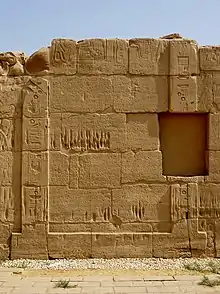 - Une version égyptienne écrite en hiéroglyphes a survécu grâce à deux inscriptions. L'une d'elles a été trouvé sur le mur extérieur ouest de la cour de la cachette dans le temple d'Amon à Karnak[2]. Il reproduit non seulement le texte du traité, mais rend également compte de la conclusion du traité lui-même et des scellés apposés sur le panneau. L'autre inscription est très fragmentaire et a été gravée sur la tour ouest du pylône extérieur du Ramesséum à Thèbes Ouest[2]. Il est généralement admis par la recherche que la version du traité égyptien comporte certaines inexactitudes par rapport au texte original. D'une part, les troisième et quatrième colonnes du texte du traité ont probablement été permutées lors des inscriptions, c'est pourquoi les lignes 32 et suivantes suivent la ligne 24 et les lignes 25 à 31 apparaissent en encart[3]. D'autre part, le texte du contrat suit la propagande du souverain égyptien, le grand roi Hattusili III, qui était l'égal du pharaon, étant rétrogradé au simple rang de roitelet[4].