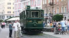 Tramway historique aux couleurs de la brasserie Zlatý Bažant (en) servant de restaurant sur la rue principale de Košice, photographié en 2007.