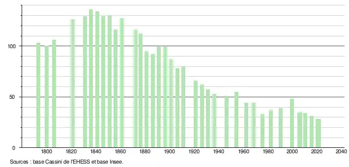 L'évolution du nombre d'habitants est connue à travers les recensements de la population effectués dans la commune depuis 1793. Pour les communes de moins de 10 000 habitants, une enquête de recensement portant sur toute la population est réalisée tous les cinq ans, les populations légales des années intermédiaires étant quant à elles estimées par interpolation ou extrapolation[21]. Pour la commune, le premier recensement exhaustif entrant dans le cadre du nouveau dispositif a été réalisé en 2005[22].