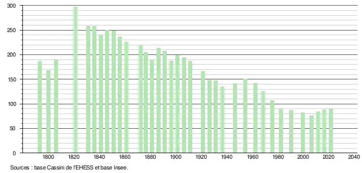 L'évolution du nombre d'habitants est connue à travers les recensements de la population effectués dans la commune depuis 1793. Pour les communes de moins de 10 000 habitants, une enquête de recensement portant sur toute la population est réalisée tous les cinq ans, les populations légales des années intermédiaires étant quant à elles estimées par interpolation ou extrapolation[20]. Pour la commune, le premier recensement exhaustif entrant dans le cadre du nouveau dispositif a été réalisé en 2006[21].