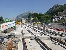 Une rame Citadis 402 et une rame TFS se croisant près de la gare de Grenoble. | ||