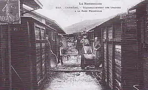 « Sur des voies parallèles, les wagons espagnols sont placés parallèlement à des wagons français. Un pont en bois relie les portières des deux wagons. Une équipe de transbordeuses monte sur ce pont. L'équipe se compose de cinq femmes : trois d'entre elles remplissent les couffes d'oranges dans le wagon espagnol ; la quatrième les transporte à proximité du wagon français ; la cinquième, « la videuse » vide les couffes dans ce wagon et aménage la paille et le papier protecteurs, pour que la marchandise arrive en bon état. La douane plombe le wagon et les pommes d'or reprennent leur voyage. »