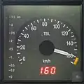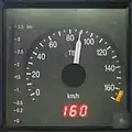 ![]() | Vitesse plafond : vitesse maximale autorisée (plus petite des vitesses maximales entre celle de la ligne et celle du matériel); ici, c'est 160 km/h. Les afficheurs allumés sont celui de la vitesse-but (nombre 160) et le bargraphe de la vitesse instantanée autorisée (autour de l'indicateur de vitesse). |