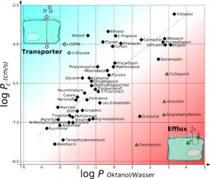 On peut caractériser utilement la lipophilie par le coefficient de partage octanol-eau, exprimant le logarithme des concentrations d'une molécule en présence d'un mélange octanol-eau. Par exemple, si logP est de 3,8, pour une substance, c'est qu'elle se dissout 103,8 fois plus dans l'octanol (lipophile) que dans l’eau (hydrophile). Les valeurs de logP positives caractérisent les substances lipophiles et les négatives les hydrophiles. Les substances lipophiles peuvent en principe passer plus facilement à travers les membranes plasmiques des cellules. Mais cet effet s'atténue au-dessus de 3, car les substances commencent à avoir une affinité pour se lier aux protéines. Néanmoins, logP est un indicateur important pour la capacité d'une substance à diffuser à travers la barrière hémato-encéphalique[15].