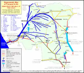 En 2007 les chemins de fer du pays ont pratiquement cessé de rouler en dehors de la ligne Matadi-Kinshasa. A cette date le trafic marchandises par voie ferrée représente moins du dixième de ce qu'il était avant l'indépendance[13].