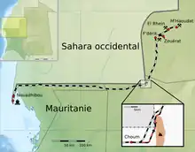 En partant de l'océan, en allant d'ouest en est, la voie ferrée suit la frontière entre la Mauritanie et le Sahara occidental, jusqu'à Choum puis remonte vers le nord. Avant 1978, elle traversait la montagne Choum par un tunnel, mais celui-ci est maintenant fermé et le terrain est difficile. Actuellement, elle contourne ce passage en pénétrant sur km dans le territoire du Sahara occidental.