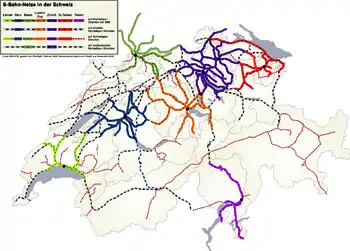 Le premier RER est celui de Zurich. Construit à partir de 1981 et mis en service en 1990 c'est également le plus dense. Depuis, des réseaux ont été créés dans la plupart des agglomérations.