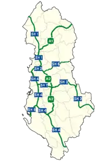 L'Albanie est maillée par un réseau de 18 000 km de routes[2], dont la qualité varie fortement. La chute du communisme en Europe a laissé les routes albanaises en piètre état, mais l'Etat a entrepris la rénovation des infrastructures et la modernisation à partir des années 2000, les premières autoroutes sont apparues. Les principales villes du pays sont aujourd'hui interconnectées entre elles par des voies rapides ou autoroutes, et au moins par des routes simples en bon état. Ainsi, un réseau rapide et performant côtoie un réseau secondaire mal entretenu sur lequel les trajets sont longs[3]. Les grands axes routiers sont connectés à deux des pays limitrophes, ou à une échelle plus large, comme la Route européenne 762, dont la capitale Tirana est une extrémité, ou la 851. En outre, la route cyclable EuroVelo 8 traverse le pays en longeant les côtes.