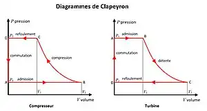 Le cycle du compresseur s'effectue dans le sens antihoraire : le travail est positif, la machine nécessite de l'énergie. Le cycle de la turbine s'effectue dans le sens horaire : le travail est négatif, la machine produit de l'énergie.