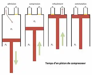 Les figures représentent les positions du piston en fin de temps (respectivement points , , et du cycle représenté sur la figure précédente). Admission : à pression constante, entrée du gaz dans la machine. Compression : les soupapes sont fermées, le volume diminue et la pression augmente. Refoulement : à pression constante, sortie du gaz. Commutation : à volume nul, inversion des soupapes et des pressions.