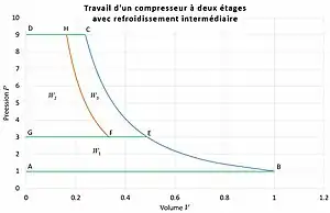 La figure ci-contre montre les cycles d'un compresseur monoétage et d'un compresseur biétage avec refroidissement intermédiaire. Le cycle du compresseur monoétage passe par les points A, B, C et D, puis il revient en A. Il nécessite un travail total égal à . Le cycle du premier étage du compresseur étagé passe par les points A, B, E et G, puis il revient en A. Il nécessite un travail égal à . Le gaz qui sort de cet étage est refroidi avant d'entrer dans le second étage. Le cycle de ce second étage passe par les points G, F, H et D, puis il revient en G. Il nécessite un travail égal à . Le travail total du compresseur étagé vaut . La disposition à deux étages avec refroidissement intermédiaire permet d'économiser le travail (entre les points F, E, C et H)[27]. Dans une machine étagée optimisée : les points B et F (entrées des deux étages) sont à la même température, les points E et H (sorties des deux étages) sont à la même température, les deux étages ont le même taux de compression (ici ) et nécessitent le même travail .