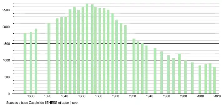 L'évolution du nombre d'habitants est connue à travers les recensements de la population effectués dans la commune depuis 1793. Pour les communes de moins de 10 000 habitants, une enquête de recensement portant sur toute la population est réalisée tous les cinq ans, les populations légales des années intermédiaires étant quant à elles estimées par interpolation ou extrapolation[18]. Pour la commune, le premier recensement exhaustif entrant dans le cadre du nouveau dispositif a été réalisé en 2006[19].
