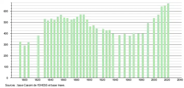 L'évolution du nombre d'habitants est connue à travers les recensements de la population effectués dans la commune depuis 1793. Pour les communes de moins de 10 000 habitants, une enquête de recensement portant sur toute la population est réalisée tous les cinq ans, les populations légales des années intermédiaires étant quant à elles estimées par interpolation ou extrapolation[18]. Pour la commune, le premier recensement exhaustif entrant dans le cadre du nouveau dispositif a été réalisé en 2006[19].