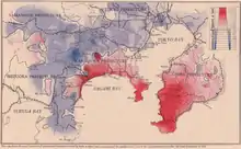 Changement de la topographie du terrain à la suite du séisme. En rouge, les zones qui sont surélevées ; en bleu, celles qui se sont affaissées.