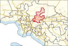 2023–en cours Arcadia, El Monte, Baldwin Park, Duarte, West Covina, Covina, Azusa, le sud de Glendora et la majeure partie de Ramona dans l'est du comté de Los Angeles ![]() |