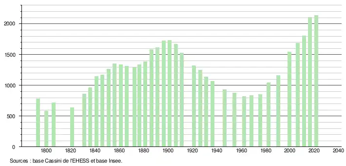 L'évolution du nombre d'habitants est connue à travers les recensements de la population effectués dans la commune depuis 1793. Pour les communes de moins de 10 000 habitants, une enquête de recensement portant sur toute la population est réalisée tous les cinq ans, les populations légales des années intermédiaires étant quant à elles estimées par interpolation ou extrapolation[23]. Pour la commune, le premier recensement exhaustif entrant dans le cadre du nouveau dispositif a été réalisé en 2006[24].