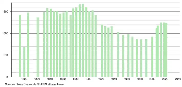L'évolution du nombre d'habitants est connue à travers les recensements de la population effectués dans la commune depuis 1793. Pour les communes de moins de 10 000 habitants, une enquête de recensement portant sur toute la population est réalisée tous les cinq ans, les populations légales des années intermédiaires étant quant à elles estimées par interpolation ou extrapolation[32]. Pour la commune, le premier recensement exhaustif entrant dans le cadre du nouveau dispositif a été réalisé en 2008[33].