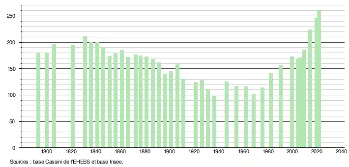 L'évolution du nombre d'habitants est connue à travers les recensements de la population effectués dans la commune depuis 1793. Pour les communes de moins de 10 000 habitants, une enquête de recensement portant sur toute la population est réalisée tous les cinq ans, les populations légales des années intermédiaires étant quant à elles estimées par interpolation ou extrapolation[18]. Pour la commune, le premier recensement exhaustif entrant dans le cadre du nouveau dispositif a été réalisé en 2004[19].