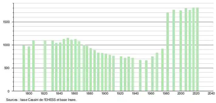 L'évolution du nombre d'habitants est connue à travers les recensements de la population effectués dans la commune depuis 1793. Pour les communes de moins de 10 000 habitants, une enquête de recensement portant sur toute la population est réalisée tous les cinq ans, les populations légales des années intermédiaires étant quant à elles estimées par interpolation ou extrapolation[27]. Pour la commune, le premier recensement exhaustif entrant dans le cadre du nouveau dispositif a été réalisé en 2006[28].
