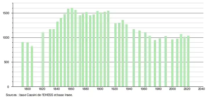 L'évolution du nombre d'habitants est connue à travers les recensements de la population effectués dans la commune depuis 1793. Pour les communes de moins de 10 000 habitants, une enquête de recensement portant sur toute la population est réalisée tous les cinq ans, les populations légales des années intermédiaires étant quant à elles estimées par interpolation ou extrapolation[23]. Pour la commune, le premier recensement exhaustif entrant dans le cadre du nouveau dispositif a été réalisé en 2006[24].