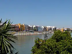 Le district de Triana, le pont Isabelle II et le Guadalquivir. Au centre de la photo peut être vu la Chapelle du Carmel, au-dessus du musée du château de San Jorge. Le clocher à sa gauche est celui de l'église de Santa Ana. Au fond, tout à gauche, se trouvent les immeubles du district de Los Remedios