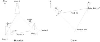 Un navire peut ainsi connaître sa position en relevant la direction d'observation (angle par rapport au Nord) de deux points distants (par exemple un clocher d'église, un phare) ; il lui suffit alors, sur une carte, de tracer les droites passant par les points observés et ayant la direction relevée, l'intersection de ces droites étant la position du navire. Pour lever les imprécisions de mesure, on utilise généralement trois points de repère, appelés amers. C'est la navigation par relèvement.
