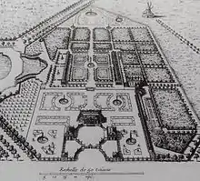 Sur la terrasse sont dessinés deux grands parterres de fleurs ornés d'une fontaine décorée de faïences. Un astucieux système a été imaginé par le jardinier Michel II le Bouteux, petit-neveu par alliance d'André Le Nôtre[9] pour permettre de présenter différentes compositions de parterres en un minimum de temps. Les fleurs sont plantées dans des pots et les pots enterrés dans le sol ce qui permet de changer les pots de place à volonté. Les compositions florales peuvent ainsi être modifiées au cours d'une même journée, offrant au roi et à ses invités un spectacle totalement renouvelé[10].