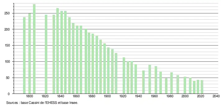 L'évolution du nombre d'habitants est connue à travers les recensements de la population effectués dans la commune depuis 1793. Pour les communes de moins de 10 000 habitants, une enquête de recensement portant sur toute la population est réalisée tous les cinq ans, les populations légales des années intermédiaires étant quant à elles estimées par interpolation ou extrapolation[30]. Pour la commune, le premier recensement exhaustif entrant dans le cadre du nouveau dispositif a été réalisé en 2006[31].