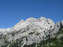 Après une tentative infructueuse en 1777 par le professeur Belsazar Hacquet[13], la première ascension est réussie le par trois habitants de la localité de Bohinjska Bistrica, Luka Korošec, Matija Kos, Štefan Rožič et l'Allemand Lovrenc Willomitzer, sur une initiative du naturaliste Žiga Zois de Ljubljana. À cette époque, la région fait partie du duché de Carniole, possession des Habsbourg. Un monument en l'honneur de ces hommes commémore l'évènement au bord du lac de Bohinj[14]. La face Nord a joué un rôle important dans le développement de l'alpinisme et a été vaincue en 1890 par Ivan Berginc-Štrukelj, natif de la vallée de Trenta, même si la première ascension officiellement homologuée est l'œuvre de F. König, H. Reinl et K. Domenigg, le [13]. Par la suite de nombreuses autres voies ont été réussies au cours du XXe siècle[2].