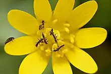 Une fois leurs œufs éclos, les jeunes larves triongulins attendent sur des fleurs ou d'autres supports attirant leur proie. À l'aide de leurs mandibules et de leurs pattes, ils s'agrippent aux poils d'insectes butineurs tels que des abeilles solitaires. Lorsque ces dernières retournent dans leur nid pour nourrir leurs larves, elles y déposent les triongulins qui se transforment rapidement en larve sédentaire peu mobile se nourrissant des réserves de pain d'abeille, au détriment des larves des abeilles[1].