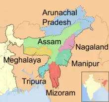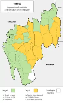 Le Tripura (bengali : ত্রিপুরা) est un État du Nord-Est de l'Inde, dont la capitale est Agartala. Troisième plus petit État de l'Inde[2], il s'étend sur 10 491,96 km2 et est bordé par le Bangladesh au nord, au sud et à l'ouest, et par les États indiens de l'Assam et du Mizoram à l'est. En 2011, l'État comptait 3 673 917 habitants, soit 0,3 % de la population indienne. Les communautés indigènes, appelées localement les Ādivāsī, constituent environ 30 % de la population du Tripura. Parmi elles, le peuple Tripuri, converti au christianisme et parlant le borok, langue tibéto-birmane, est majoritaire parmi les 19 qui composent la ville. Chassés du Pakistan oriental (actuel Bengladesh) voisin lors de la partition des Indes, les Bengalis hindouistes forment la majorité ethno-linguistique du Tripura.