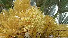 Les fleurs forment des inflorescences ramifiées à la base des feuilles inférieures, contenant jusqu'à une centaine de fleurs hermaphrodites de couleur blanchâtre ou brune de 10 à 12 mm de diamètre. Il fleurit en automne, et les fruits mûrissent vers la fin de l'été suivant ; ce sont des drupes subsphériques, de couleur jaune ou foncée, de 1,5 à 2,0 cm de diamètre, avec le mésocarpe mince et pulpeux et l'endocarpe membraneux.