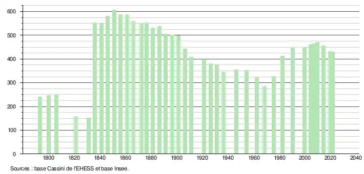 L'évolution du nombre d'habitants est connue à travers les recensements de la population effectués dans la commune depuis 1793. Pour les communes de moins de 10 000 habitants, une enquête de recensement portant sur toute la population est réalisée tous les cinq ans, les populations légales des années intermédiaires étant quant à elles estimées par interpolation ou extrapolation[23]. Pour la commune, le premier recensement exhaustif entrant dans le cadre du nouveau dispositif a été réalisé en 2004[24].