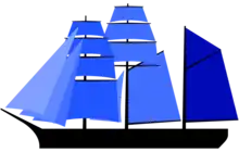 | Termes anglais | Fully rigged ship | Barque / bark | Jackass bark / Jackass barque | Barquentine / Schooner barque | Three-masted topsail schooner | Three-masted schooner | |