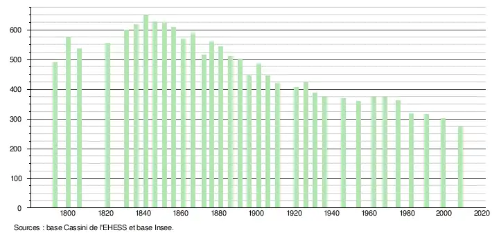 L'évolution du nombre d'habitants est connue à travers les recensements de la population effectués dans la commune depuis 1793. À partir du , les populations légales des communes sont publiées annuellement dans le cadre d'un recensement qui repose désormais sur une collecte d'information annuelle, concernant successivement tous les territoires communaux au cours d'une période de cinq ans. Pour les communes de moins de 10 000 habitants, une enquête de recensement portant sur toute la population est réalisée tous les cinq ans, les populations légales des années intermédiaires étant quant à elles estimées par interpolation ou extrapolation[20]. Pour la commune, le premier recensement exhaustif entrant dans le cadre du nouveau dispositif a été réalisé en 2008[21],[Note 1].