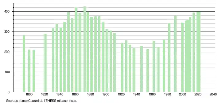 L'évolution du nombre d'habitants est connue à travers les recensements de la population effectués dans la commune depuis 1793. Pour les communes de moins de 10 000 habitants, une enquête de recensement portant sur toute la population est réalisée tous les cinq ans, les populations légales des années intermédiaires étant quant à elles estimées par interpolation ou extrapolation[16]. Pour la commune, le premier recensement exhaustif entrant dans le cadre du nouveau dispositif a été réalisé en 2004[17].